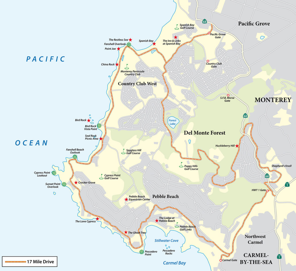 Der 17 Mile Drive befindet sich auf der Halbinsel zwischen Carmel-by-the-Sea und Monterey. Er dient auch als Hauptstraße durch die Gated Community von Pebble Beach. Pro Fahrzeug wird eine Eintrittsgebühr von 12 USD verlangt, die man jedoch zurückerstattet bekommt wenn man in einem der Pebble Beach Resort Restaurants mehr als 35USD konsumiert.